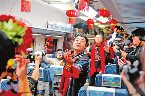 春运首日,中老铁路“跨国春运”飞驰的列车里,一场别开生面的“跨国春晚”精彩上演。1月14日上午,“一路欢歌一路情”中老铁路春节文化主题活动隆重举办。活动以中国昆明至老挝万象的D87次列车车厢为舞台,通过现场直播为全网观众呈现一场跨越国界的春晚盛宴。