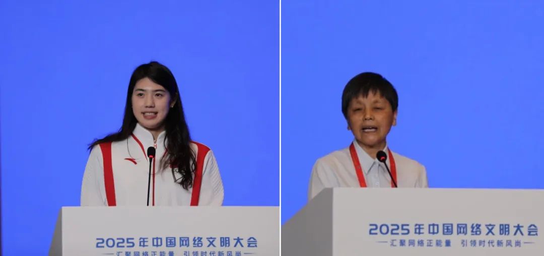 中国国家游泳队队员张雨霏(左)、第九届全国道德模范甘公荣(右)做主题演讲(拼版照片)。大会主办方供图