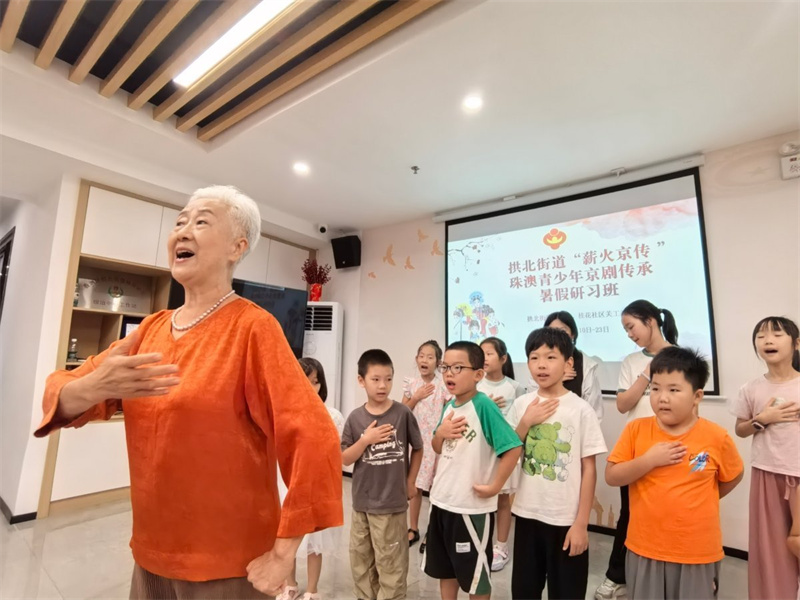 拱北街道桂花社区党群服务中心内京韵悠扬,“薪火京传”珠澳青少年京剧传承暑假研习班正式开班。京剧老师以生动语言梳理京剧自徽班进京以来的辉煌发展历程,聚焦“生、旦、净、丑”四大行当艺术特色,通过经典唱段赏析与角色特征解析,将京剧独特的脸谱艺术、程式化表演及声腔之美娓娓道来,为学员们揭开京剧神秘面纱。