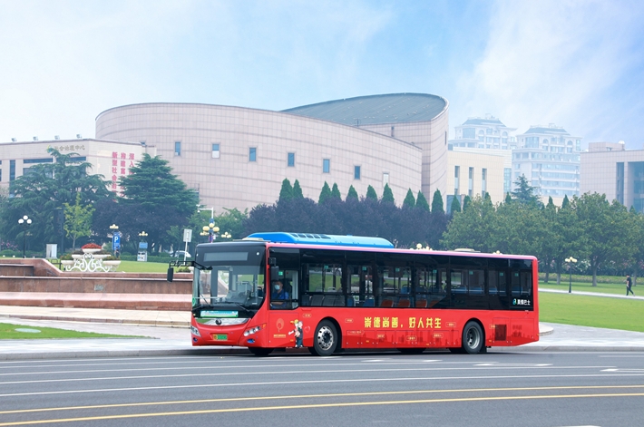 运行中的青岛真情巴士成为城市靓丽风景。