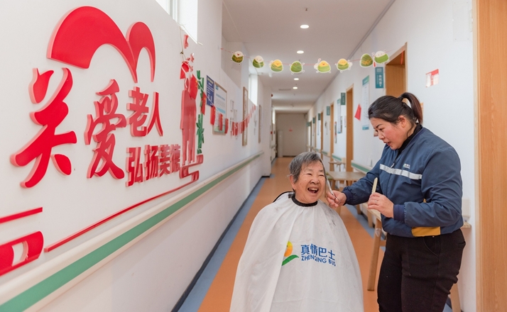 真情巴士员工关爱老人,为老人义务理发。