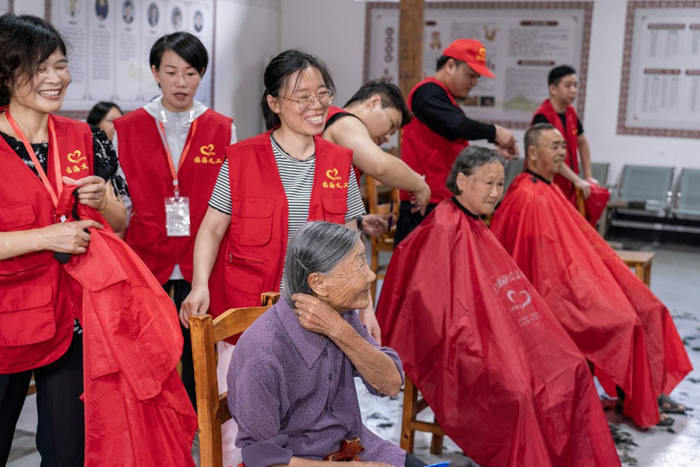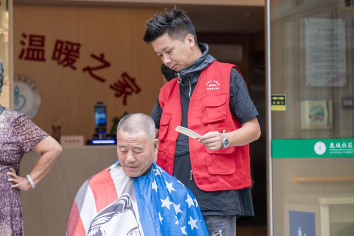 8月31日,浙江省台州市临海市鹿城社区温暖之家的志愿者们正在为居民免费理发。新华网 钟奕 摄