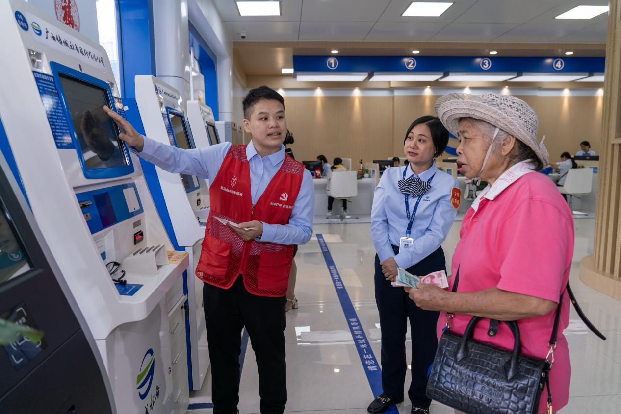 10月31日,在广西南宁市广西绿城水务大厅,志愿者和文明引导员正在帮助老人缴纳水费。新华网 钟奕 摄