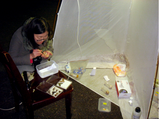 蛾类具有趋光性,灯诱须在夜深时空旷的林间开展。