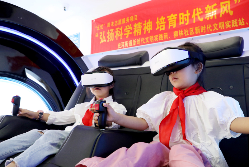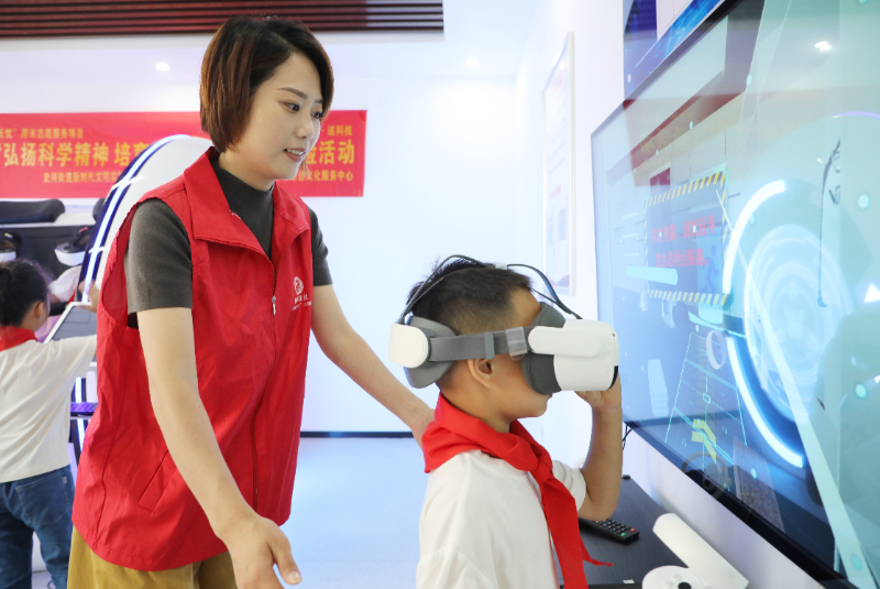 2024年9月28日,安徽省六安市叶集区史河街道柳林社区新时代文明实践站,小朋友借助“无忧”周末志愿服务项目体验VR技术,感受科技的魅力。新华网发 (田凯平 摄)