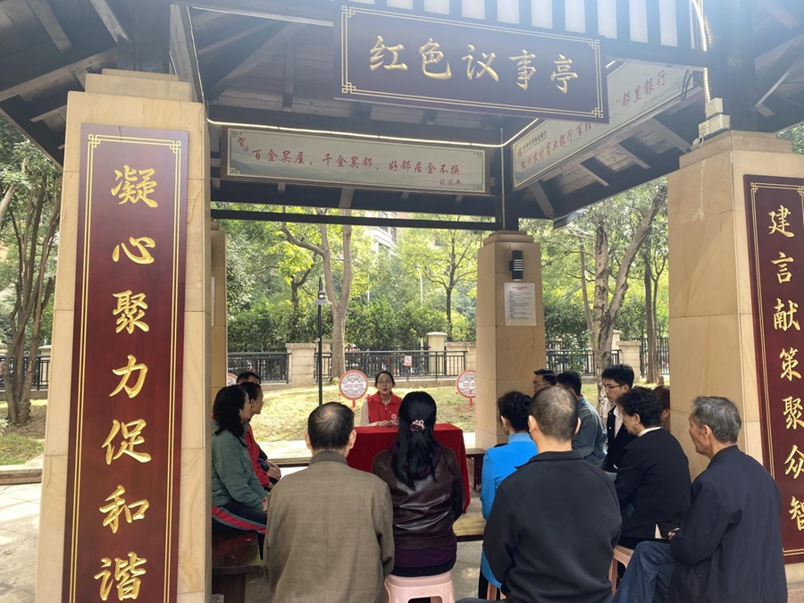 11月1日,小区居民和志愿者正在红色议事亭商议事务。新华网发(株洲文明网 龙建清 摄)