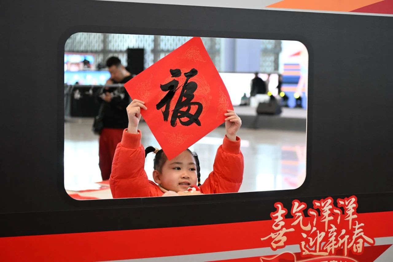 春运期间,南昌火车站“送福回家路 非遗迎新春”活动现场,旅客带着春联回家。