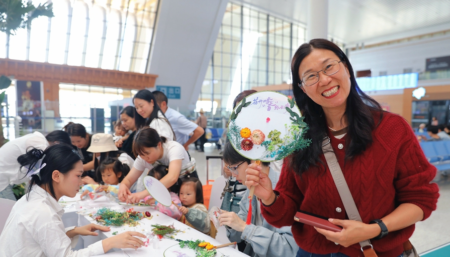 旅客展示制作好的干花团扇(摄于4月24日)。新华网发(杨紫轩 摄)