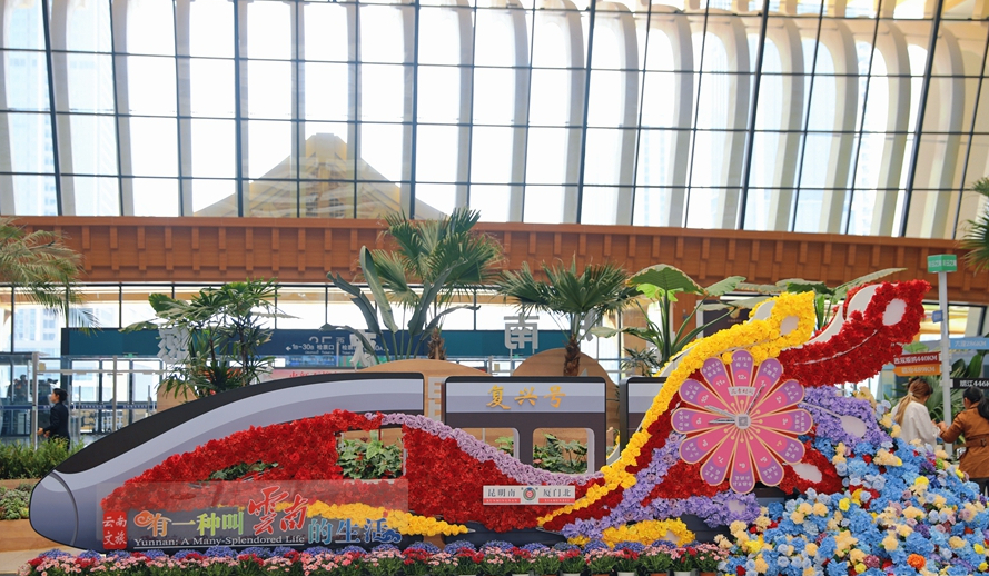 昆明南站“鲜花会客厅”打卡点(摄于4月24日)。新华网发(杨紫轩 摄)