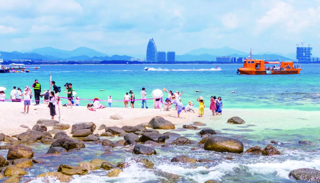 在三亚蜈支洲岛旅游区,洁白沙滩上游客踏浪戏水