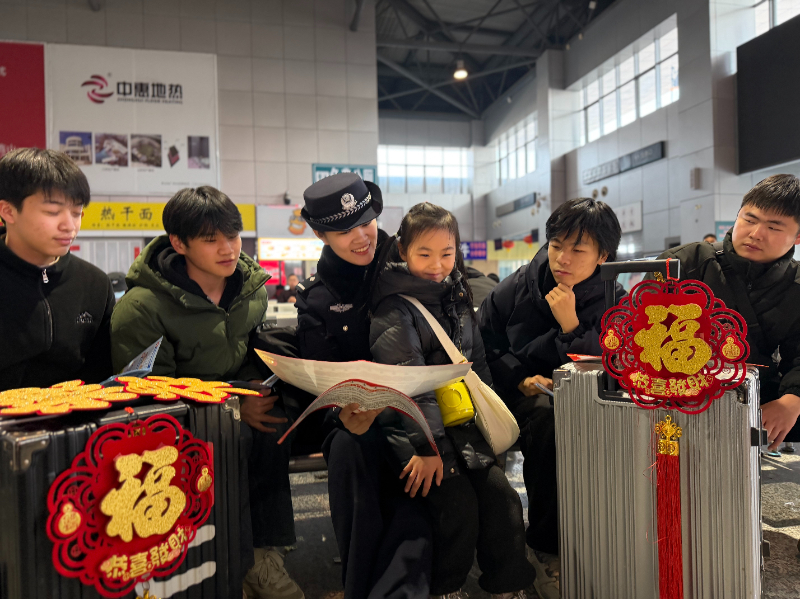 春运首日,郑州市金水区公安民警走进客运北站,为出行旅客做安全提醒。中国文明网网友@夏志伟 摄